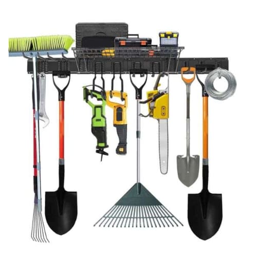 Featuring high-strength steel rails and adjustable hooks, this heavy-duty system allows you to lift shovels, rakes, and power tools off the floor to reclaim your garage space.
